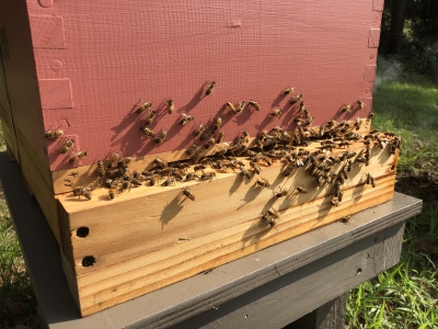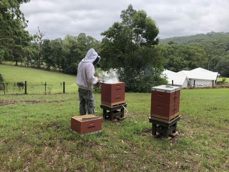 Almost three weeks ago, the ashram property got even sweeter — we now have two beautiful beehives. With the blessing of the gurus and the goddess Bhrarami, both beehives have really good numbers, strong queens and are doing really well. In this short time, they have two-thirds filled the two honey supers (the boxes on the top of the brood boxes). The boxes will be inspected again in another week as they are starting to wax cap the honey.