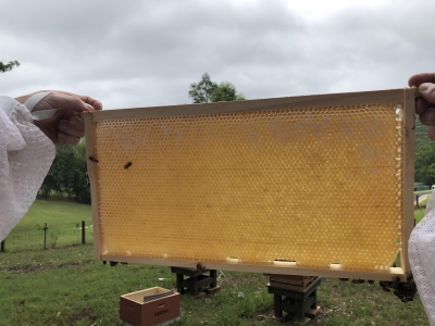 You can see in the picture of the honey frame (below), the top area in white that goes over the cells. This means the honey is ripe and ready, and we will need to add another honey super so they continue to have space to store honey. The great news is that we will have ashram honey for Baba Prajnananandaji's visit in a few months and we should also have 500g jars of honey for people to purchase at the upcoming silent retreat.